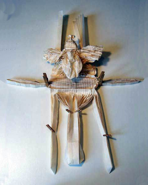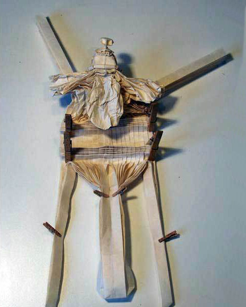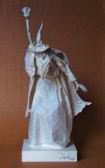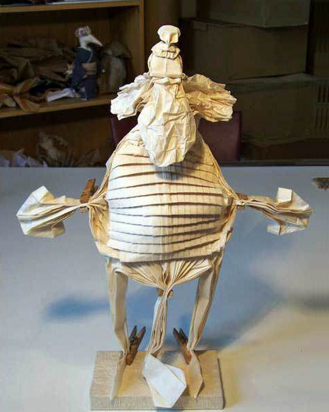 Il serait difficile de produire de tels objets sans utiliser la technique du méthyl-cellulose et du pliage humide, ni la structure métallique qui maintient le modèle dans la forme souhaitée, notamment lors des transports et des expositions. De plus, si ces personnages sont relativement grands par rapport à d’autres modèles d’origami, de nombreux détails sont très petits, et m’obligent à travailler avec certains outils de modelage (pour façonner l’argile normalement) ou avec une petite paire de pinces coupantes.