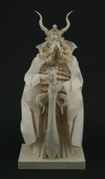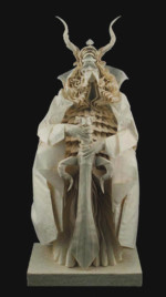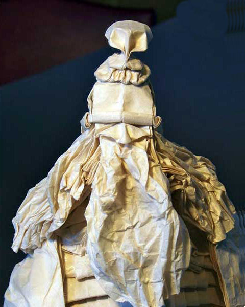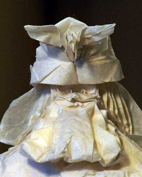 Autre différence importante : l’origami traditionnel est censé être une petite distraction populaire que le grand public peut pratiquer, et donc, supposé être relativement simple, rapide, reproductible, décrit du premier au dernier pas. Au lieu de cela, cette série de Barbares est le fruit de nombreux essais improvisés que j’ai commencé à expérimenter surtout avec les masques. Le nombre de plis est ici très important (plusieurs centaines) ; les déformations des couches de papier plus ou moins aléatoires et souvent complexes, et ces modèles comportent toujours une grande part d’improvisation. Alors c’est moi, et parfois plutôt que moi, le papier lui-même qui a dirigé le travail. Mes modèles ne sont donc pas reproductibles. Même moi, je suis généralement incapable d’en produire une copie !
