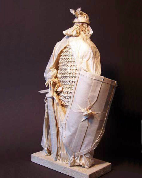 Laissez-moi essayer d’expliquer les différentes étapes de l’origami que j’ai traversées au cours de ma carrière, le résultat actuel est la série des « Barbares » (que j’appelle ainsi en référence au film « Conan le Barbare » avec Arnold Swartzenegger), un personnage de « Merveilleux héroïque » qui pourrait représenter le premier modèle de la série (en fait, je l’ai changé en Aragorn, le Seigneur des Anneaux.)