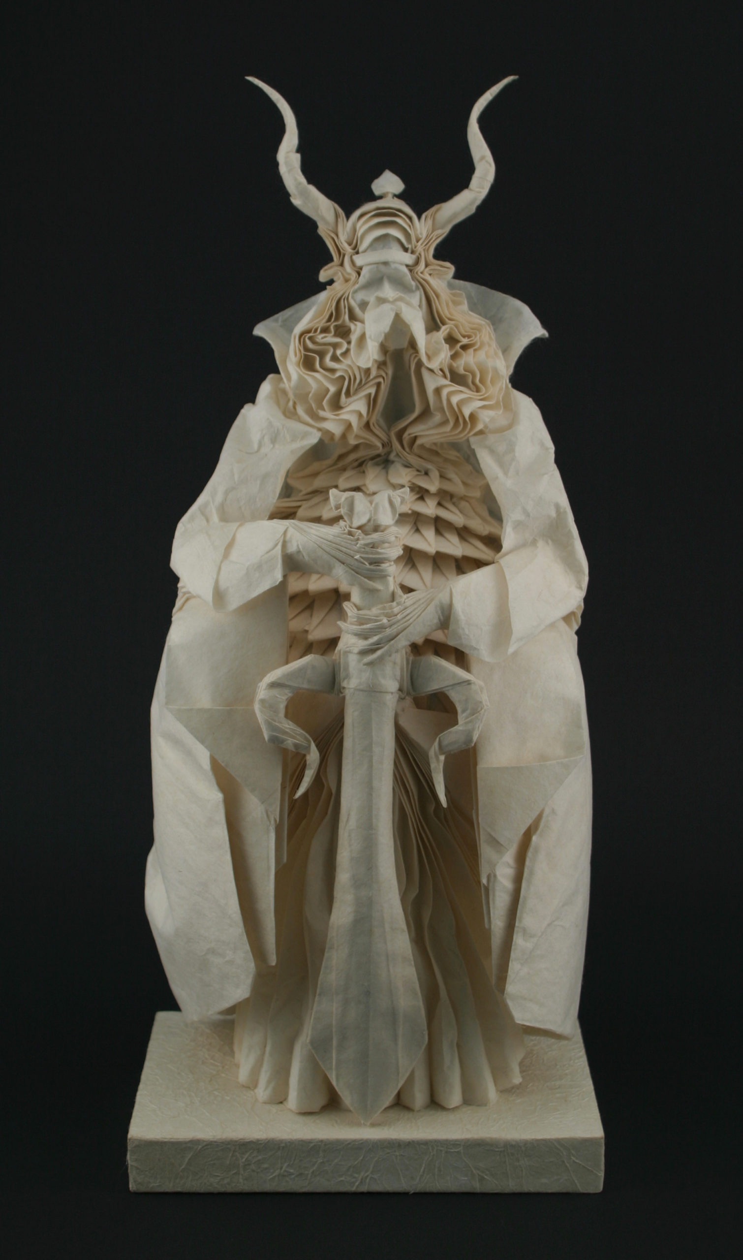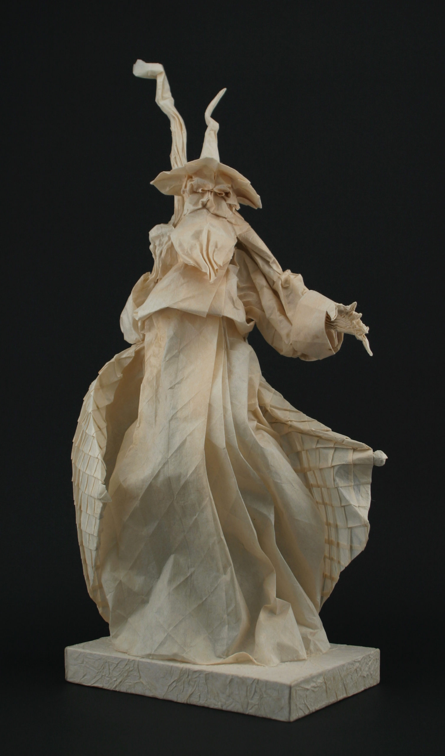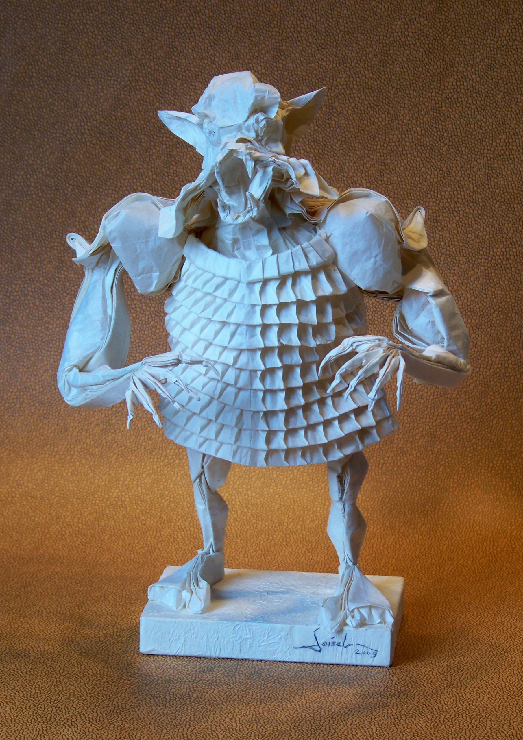 Il serait difficile de produire de tels objets sans utiliser la technique du méthyl-cellulose et du pliage humide, ni la structure métallique qui maintient le modèle dans la forme souhaitée, notamment lors des transports et des expositions. De plus, si ces personnages sont relativement grands par rapport à d’autres modèles d’origami, de nombreux détails sont très petits, et m’obligent à travailler avec certains outils de modelage (pour façonner l’argile normalement) ou avec une petite paire de pinces coupantes.