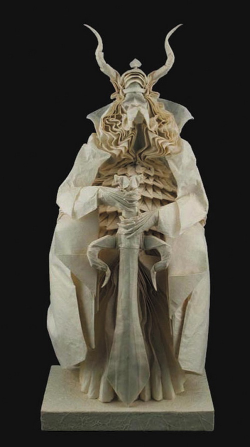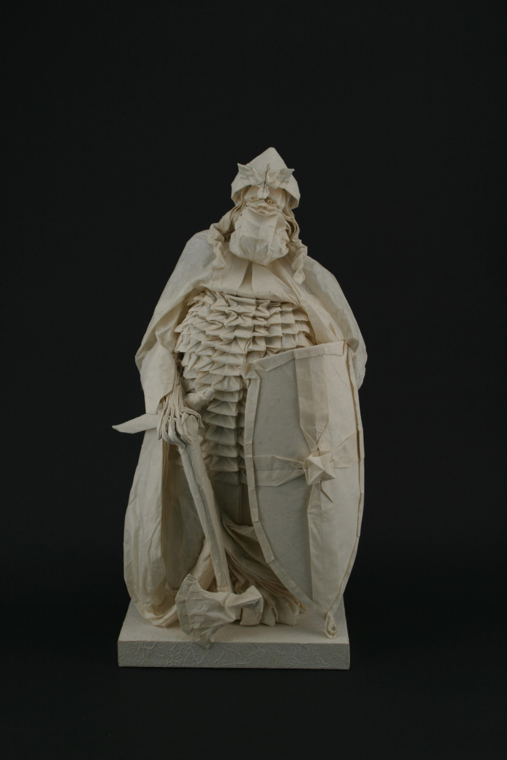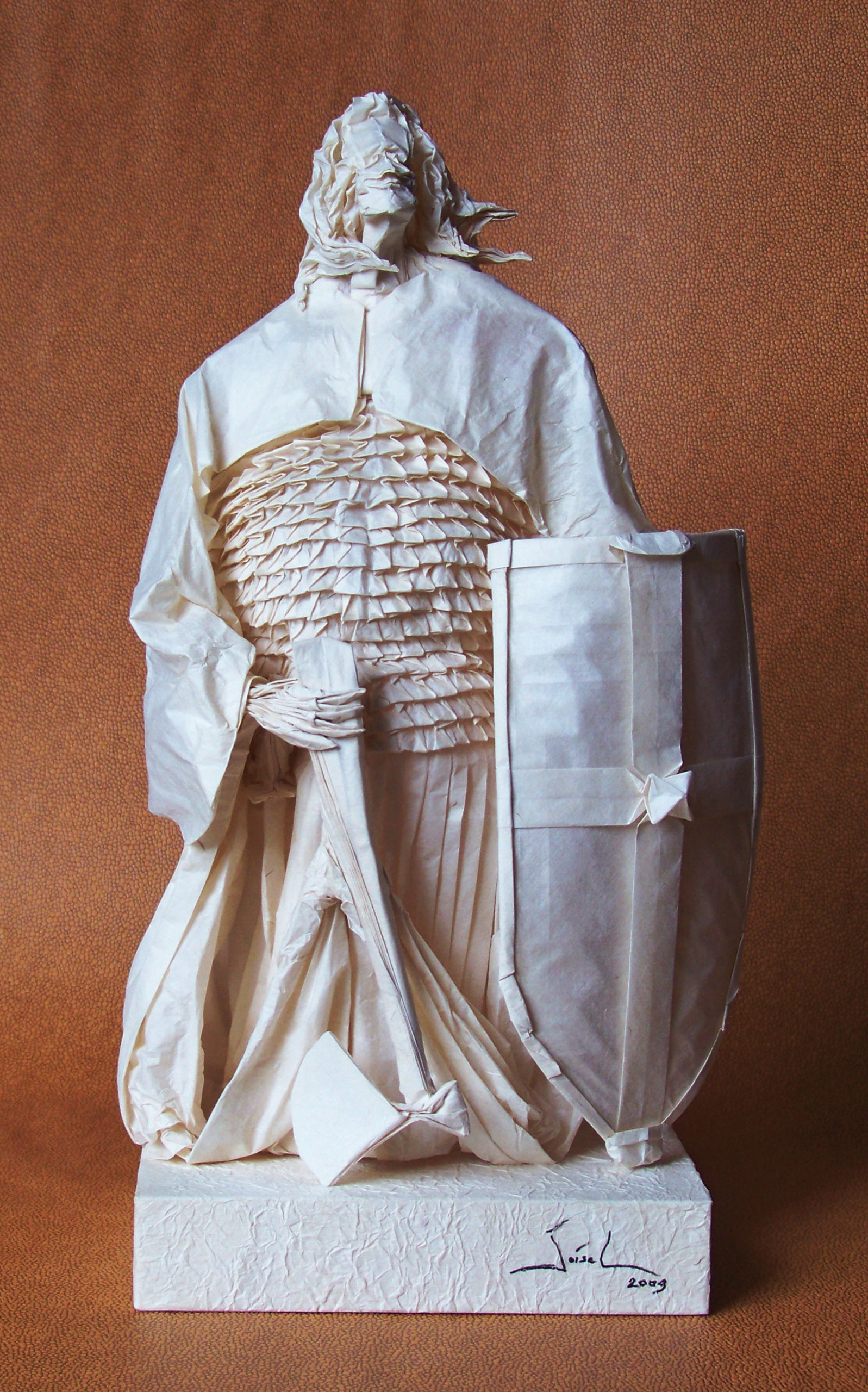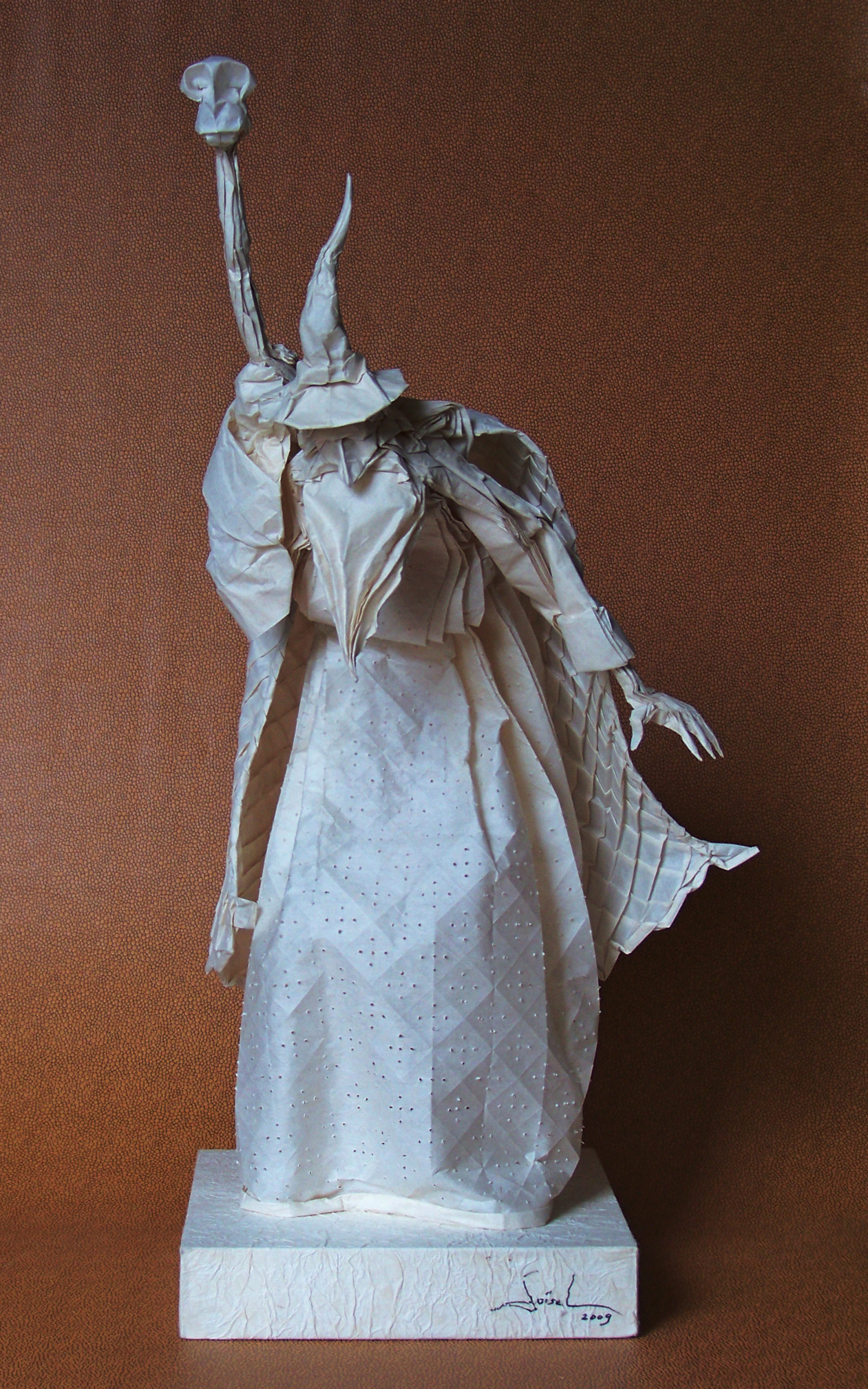 Il serait difficile de produire de tels objets sans utiliser la technique du méthyl-cellulose et du pliage humide, ni la structure métallique qui maintient le modèle dans la forme souhaitée, notamment lors des transports et des expositions. De plus, si ces personnages sont relativement grands par rapport à d’autres modèles d’origami, de nombreux détails sont très petits, et m’obligent à travailler avec certains outils de modelage (pour façonner l’argile normalement) ou avec une petite paire de pinces coupantes.