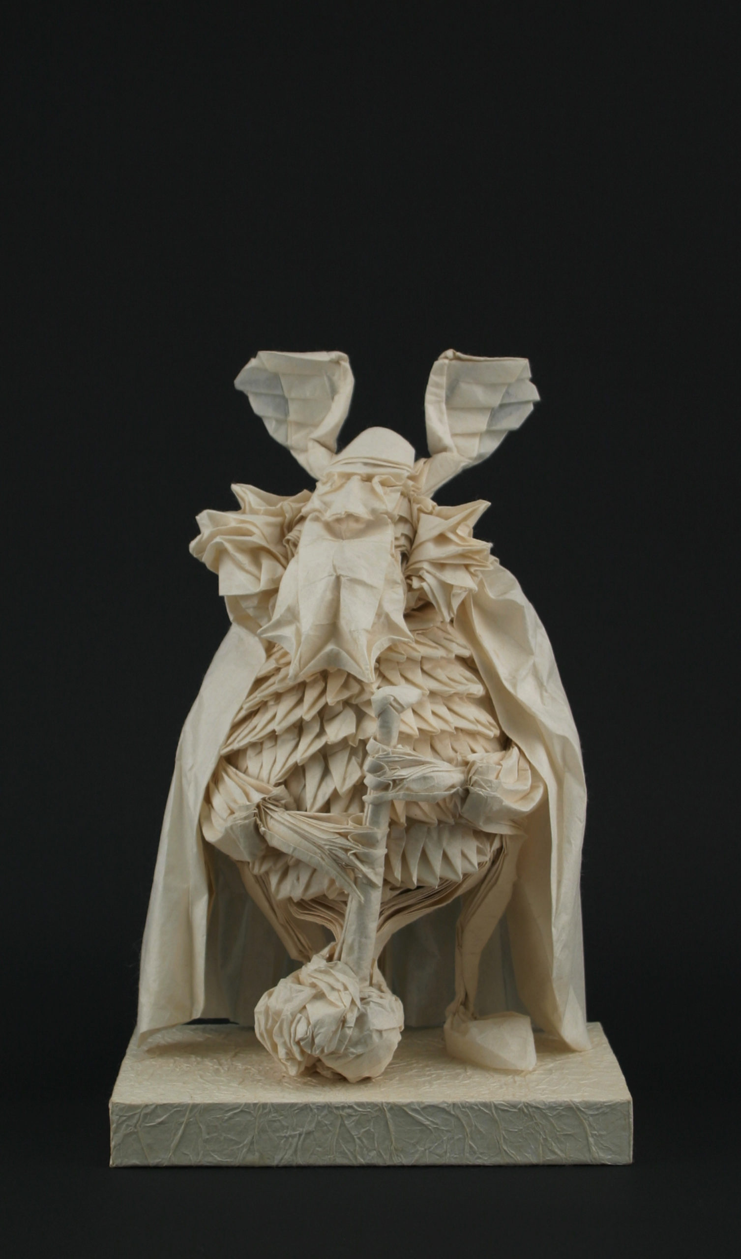 Autre différence importante : l’origami traditionnel est censé être une petite distraction populaire que le grand public peut pratiquer, et donc, supposé être relativement simple, rapide, reproductible, décrit du premier au dernier pas. Au lieu de cela, cette série de Barbares est le fruit de nombreux essais improvisés que j’ai commencé à expérimenter surtout avec les masques. Le nombre de plis est ici très important (plusieurs centaines) ; les déformations des couches de papier plus ou moins aléatoires et souvent complexes, et ces modèles comportent toujours une grande part d’improvisation. Alors c’est moi, et parfois plutôt que moi, le papier lui-même qui a dirigé le travail. Mes modèles ne sont donc pas reproductibles. Même moi, je suis généralement incapable d’en produire une copie !